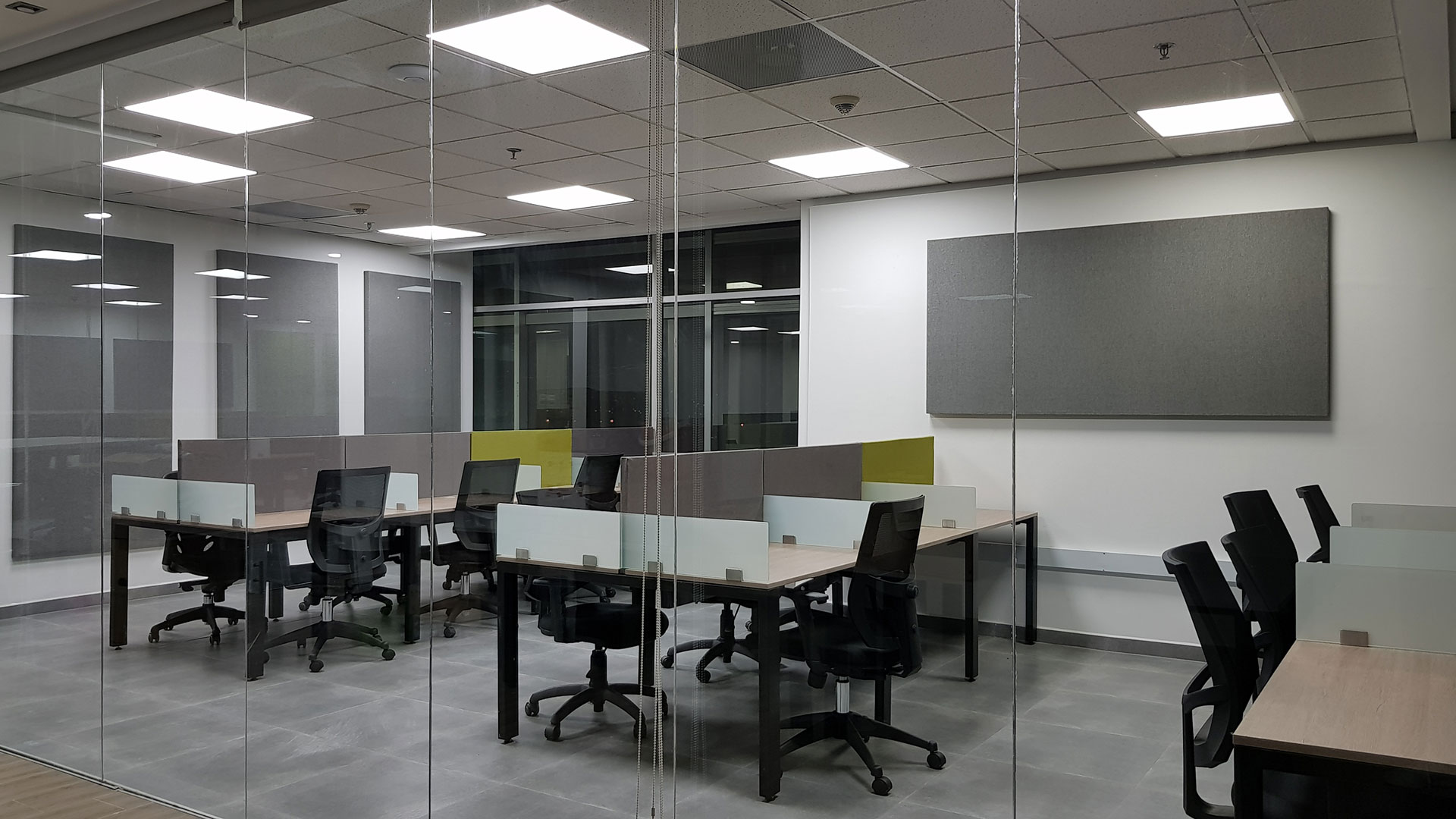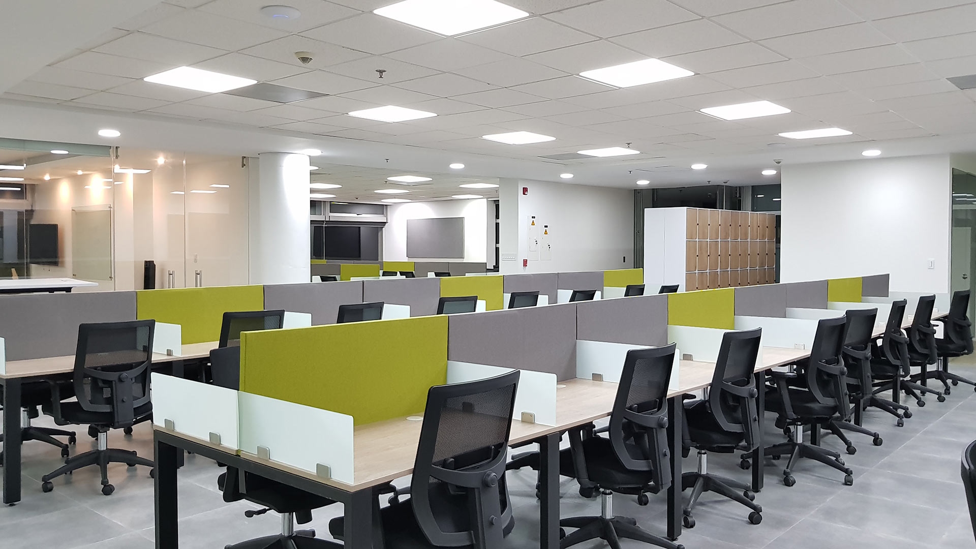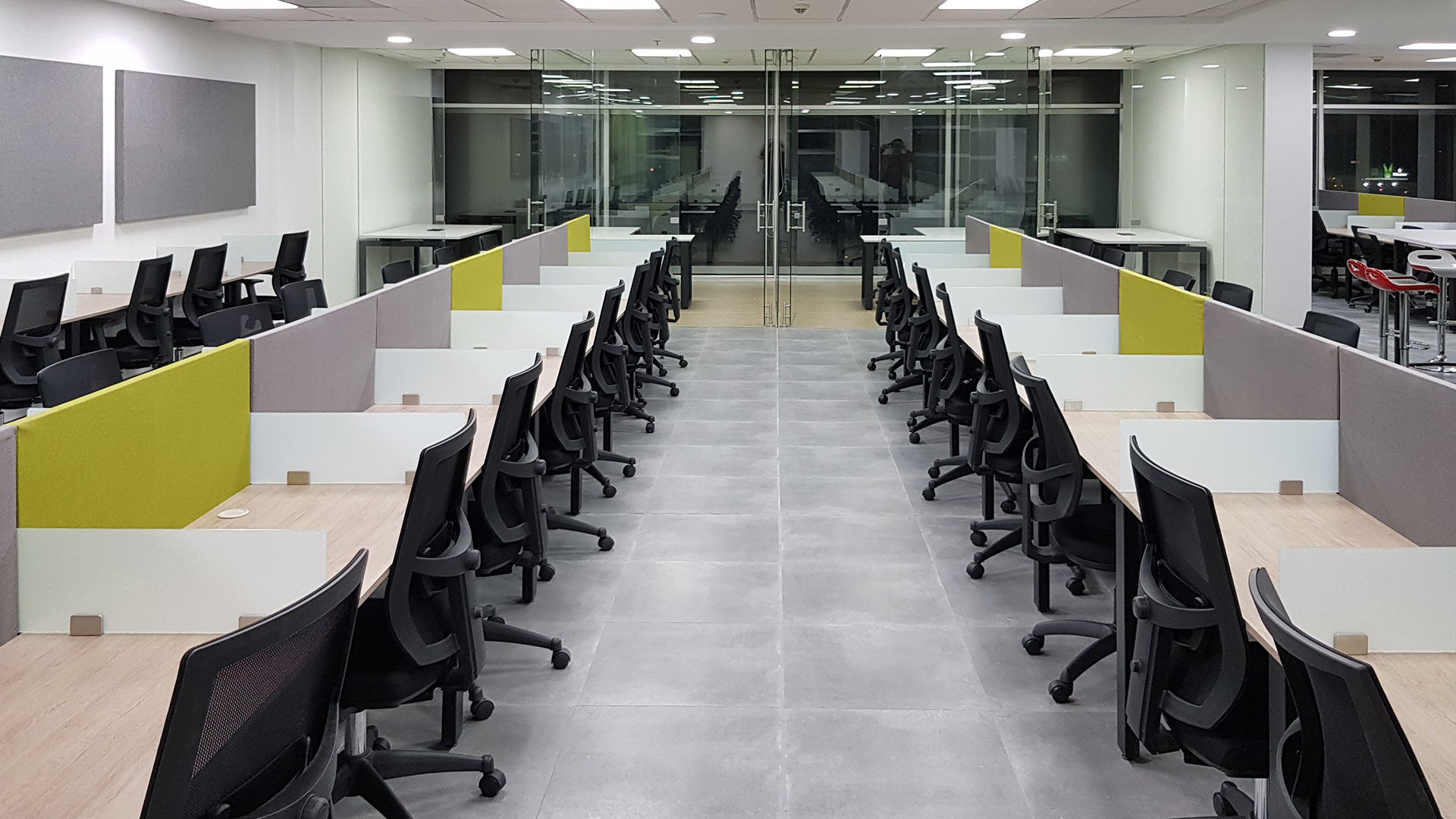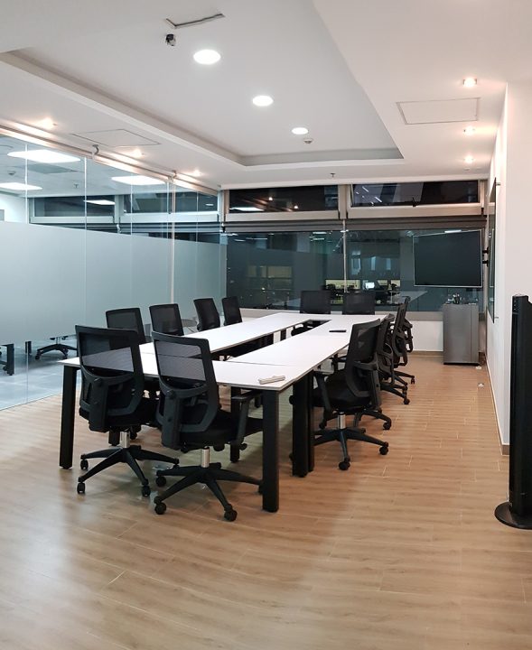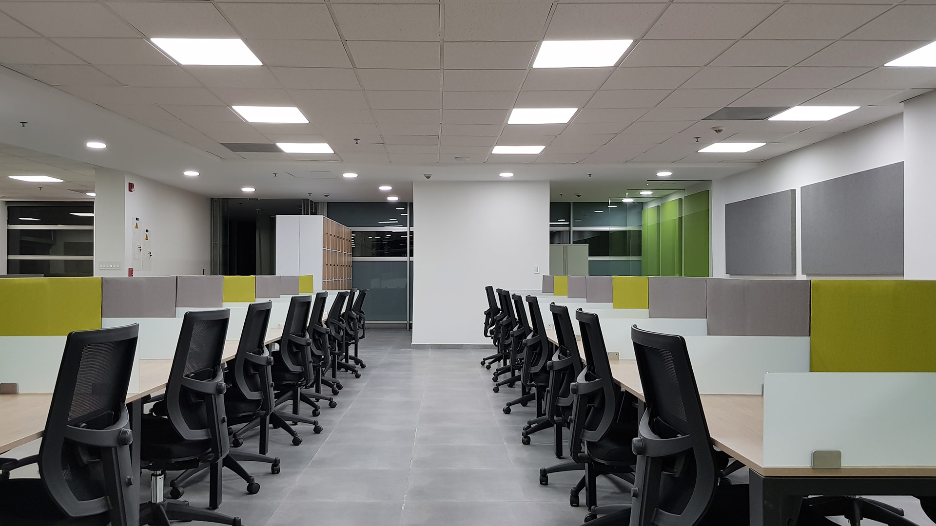 El diseño interior creo un contraste entre las zonas abiertas de puestos de trabajo, con tonos neutros, grises y blancos y acentos con los colores corporativos y las zonas cerradas de salas y oficinas, donde la inclusión de piso con acabo tipo madera y el uso de luz amarilla aportaba un toque calidez.