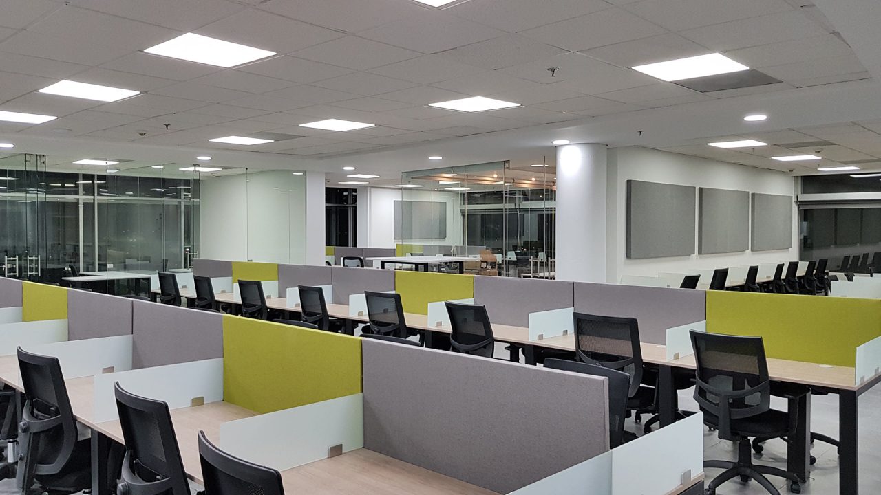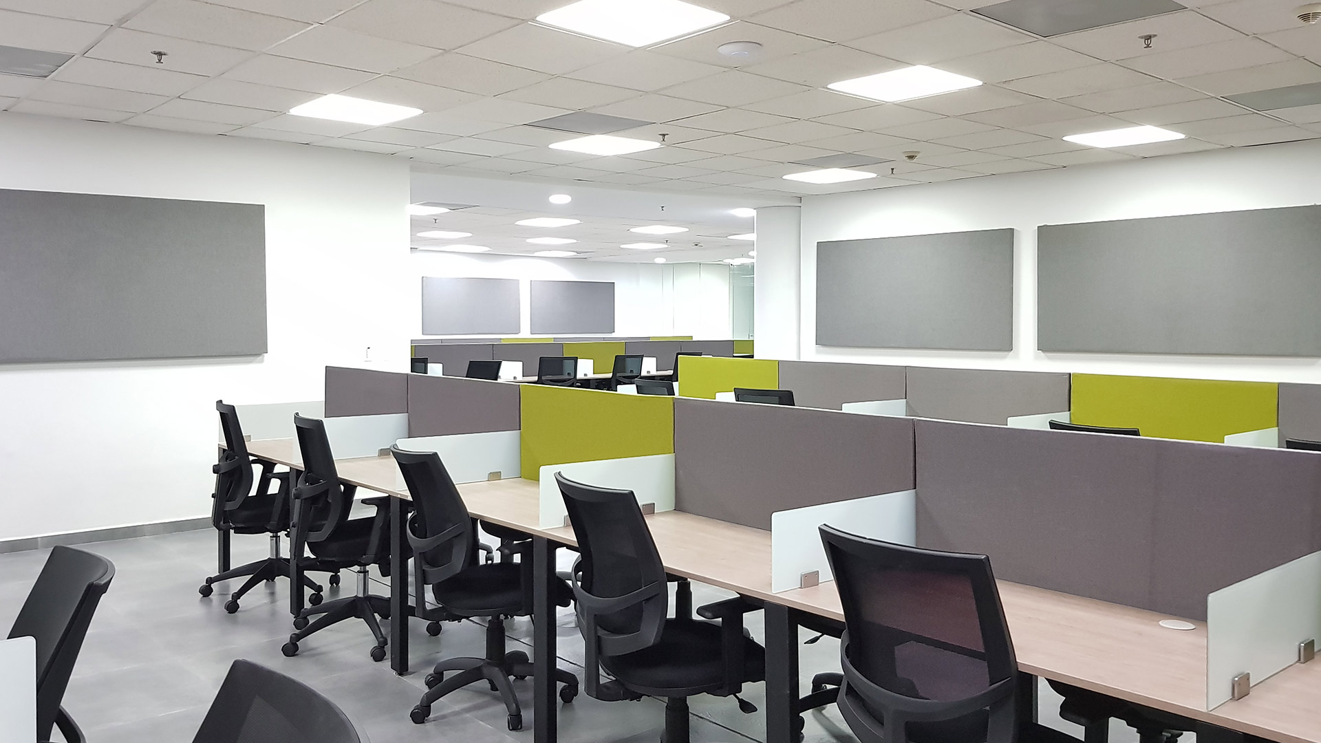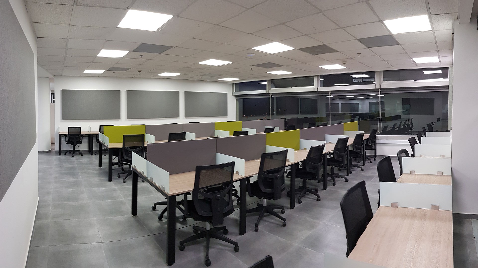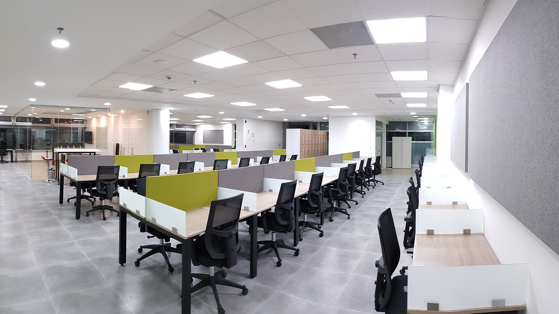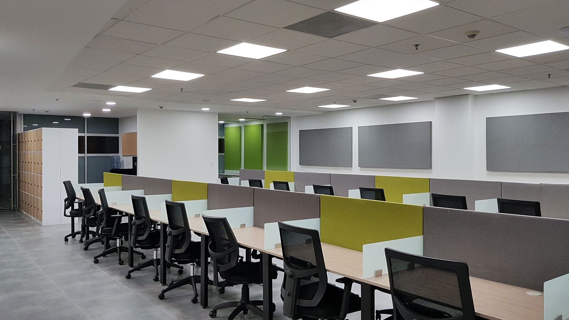 El diseño interior creo un contraste entre las zonas abiertas de puestos de trabajo, con tonos neutros, grises y blancos y acentos con los colores corporativos y las zonas cerradas de salas y oficinas, donde la inclusión de piso con acabo tipo madera y el uso de luz amarilla aportaba un toque calidez.