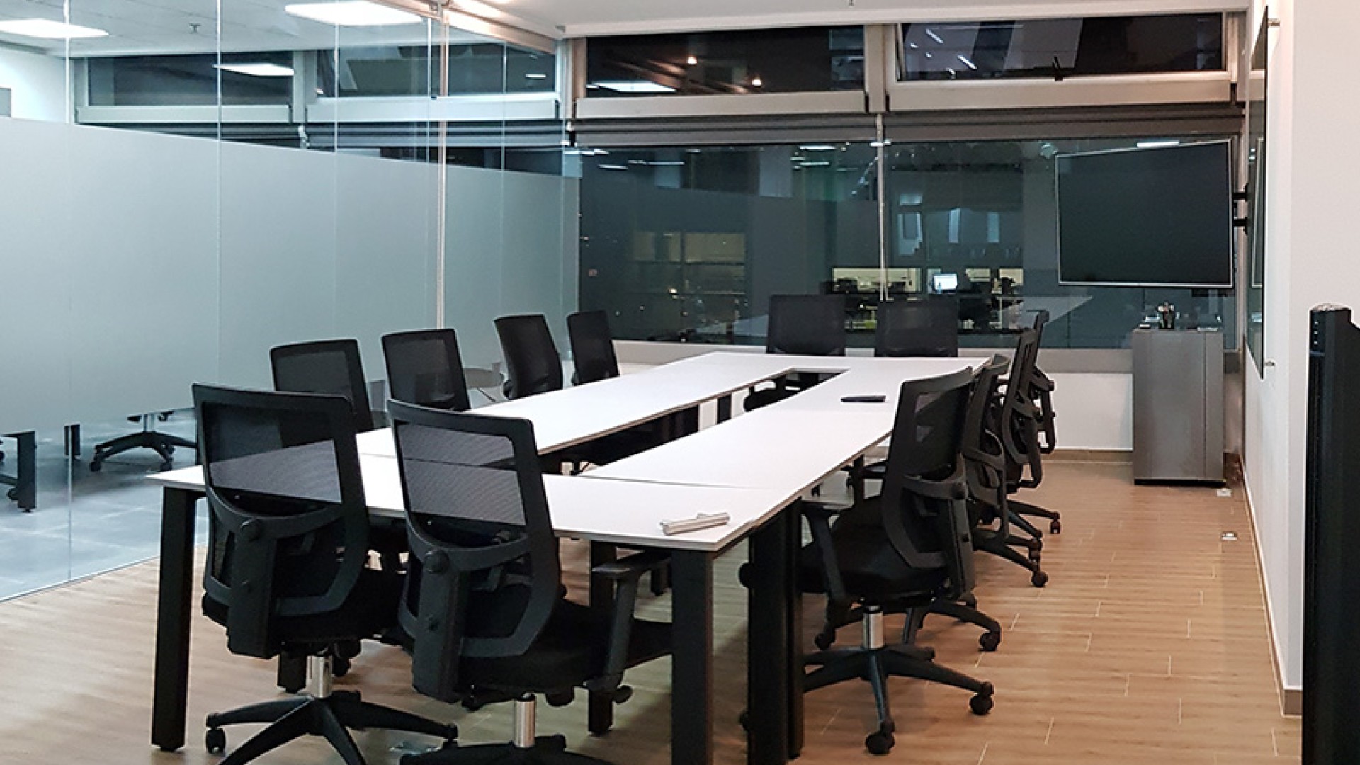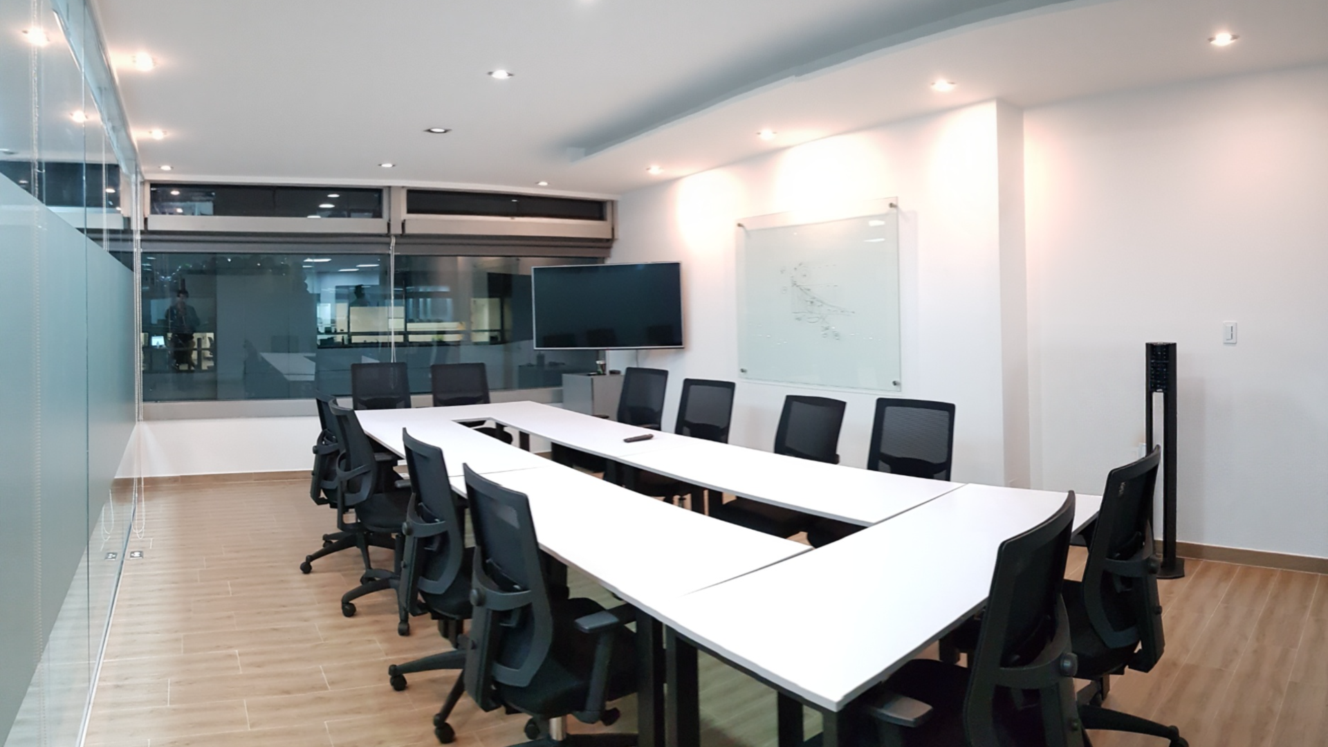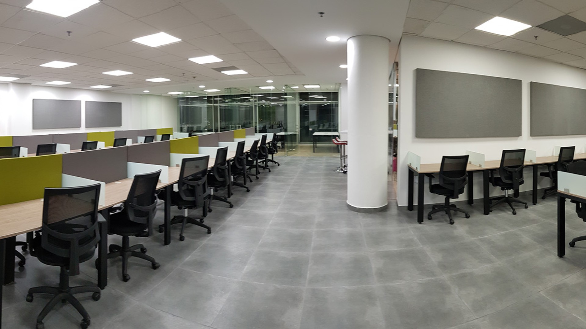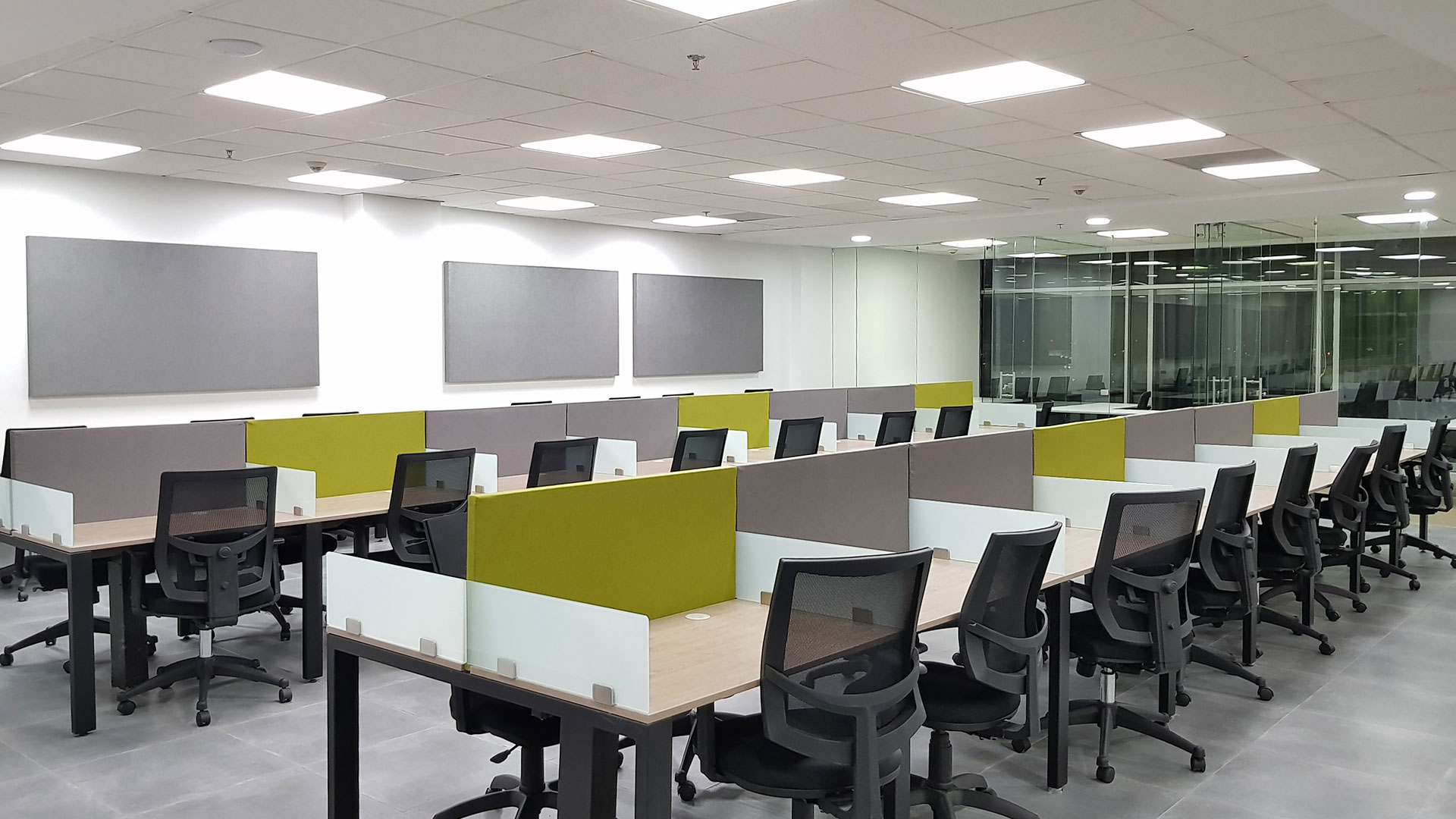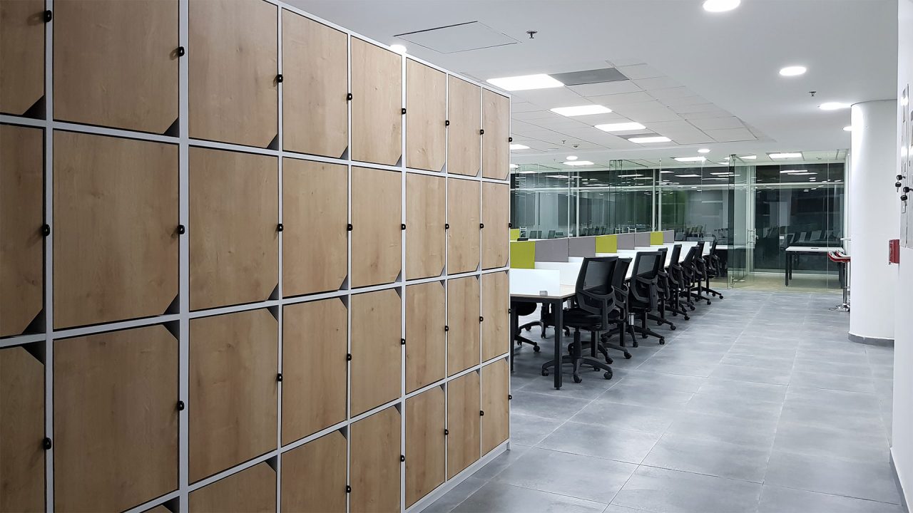 El diseño interior creo un contraste entre las zonas abiertas de puestos de trabajo, con tonos neutros, grises y blancos y acentos con los colores corporativos y las zonas cerradas de salas y oficinas, donde la inclusión de piso con acabo tipo madera y el uso de luz amarilla aportaba un toque calidez.
