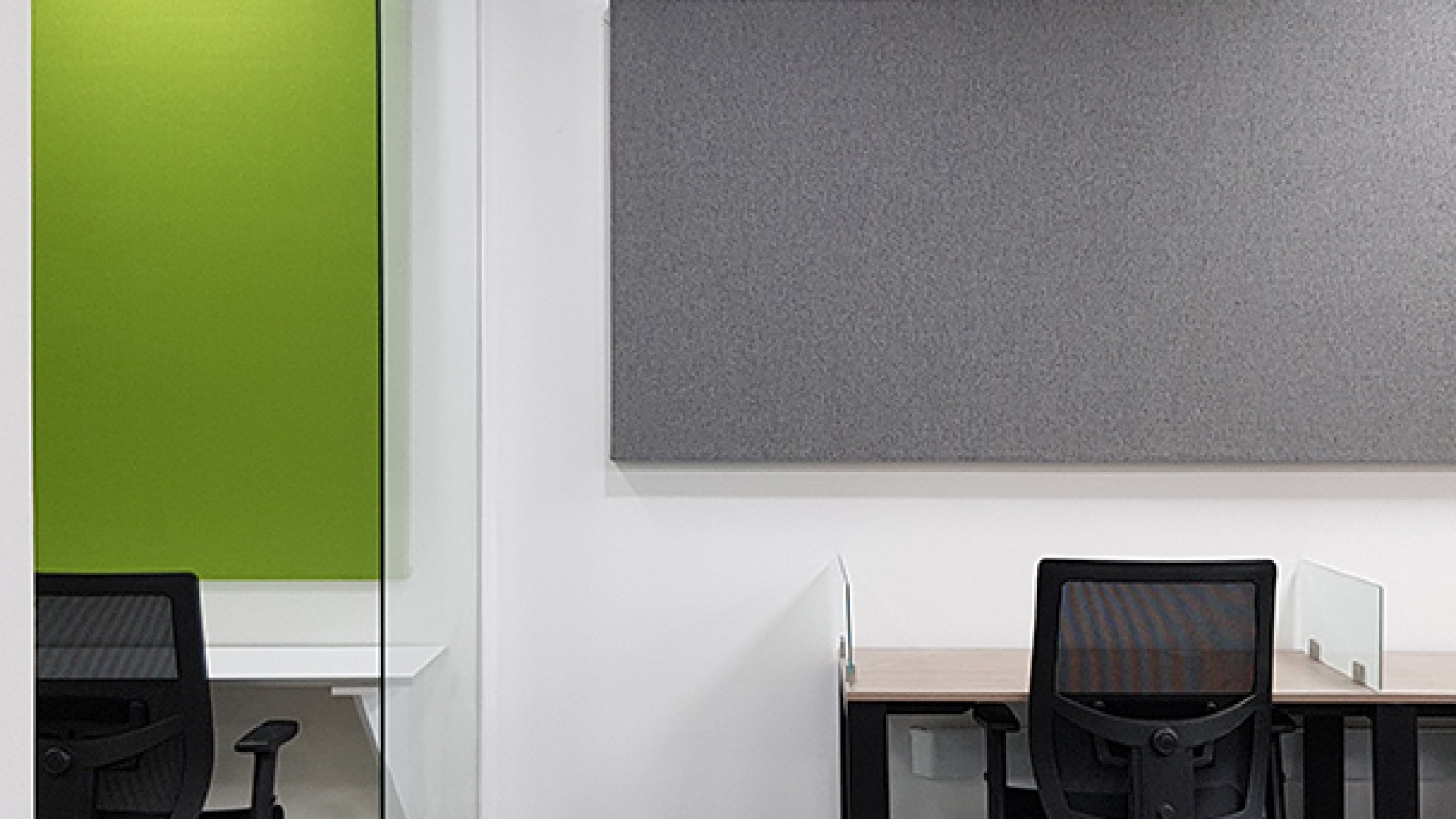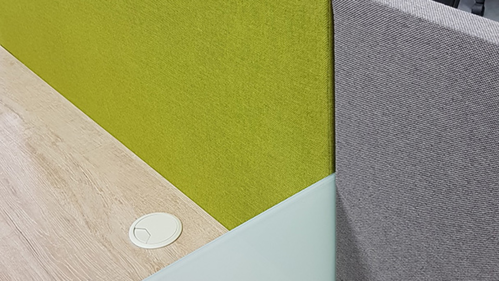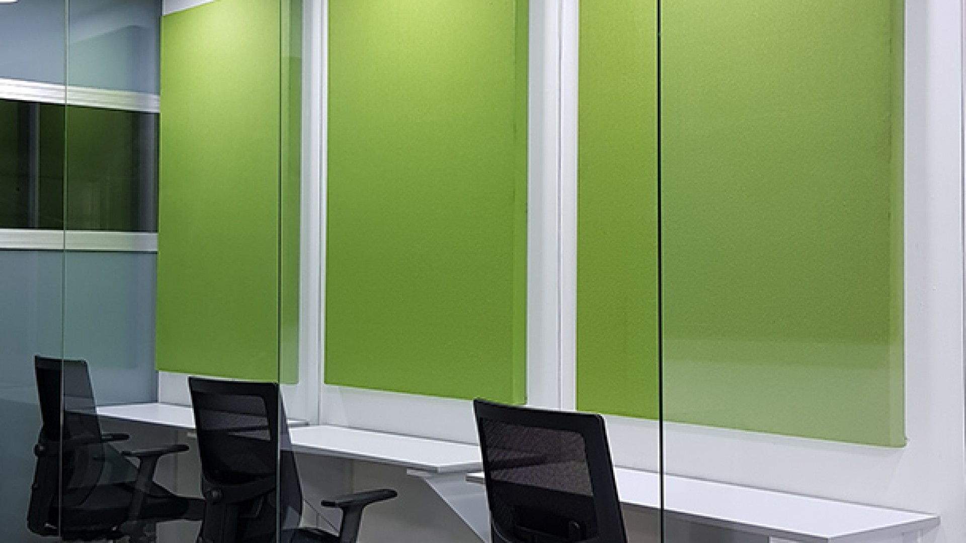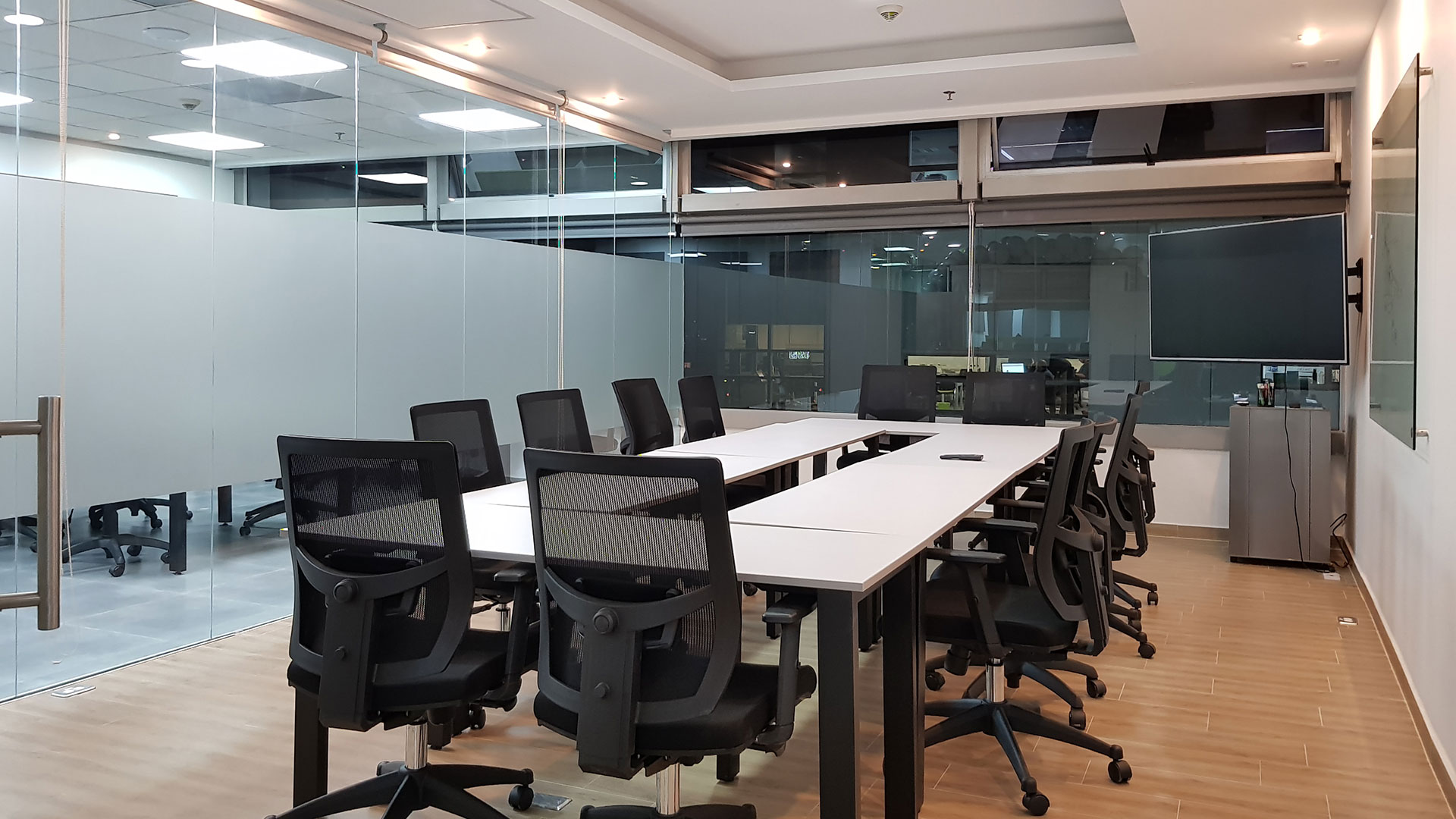 El diseño interior creo un contraste entre las zonas abiertas de puestos de trabajo, con tonos neutros, grises y blancos y acentos con los colores corporativos y las zonas cerradas de salas y oficinas, donde la inclusión de piso con acabo tipo madera y el uso de luz amarilla aportaba un toque calidez.