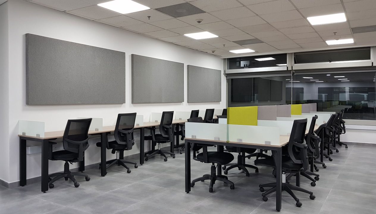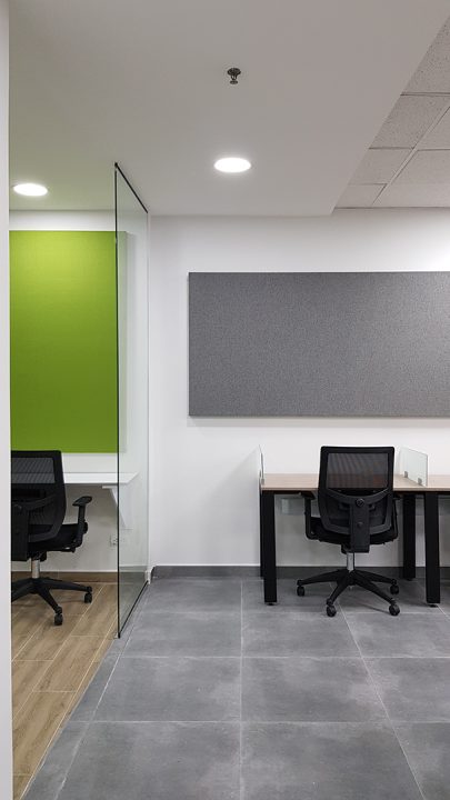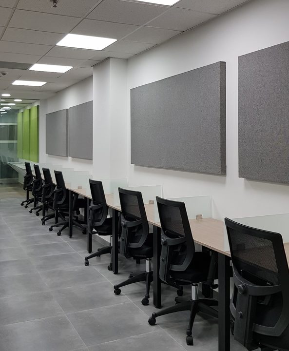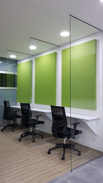 Esta variable condiciono la distribución espacial, generado 3 zonas independientes para puestos de trabajo, que, al estar enfocados en llamadas, se complementaron con divisiones con materiales absorbentes y paneles acústicos en paredes.